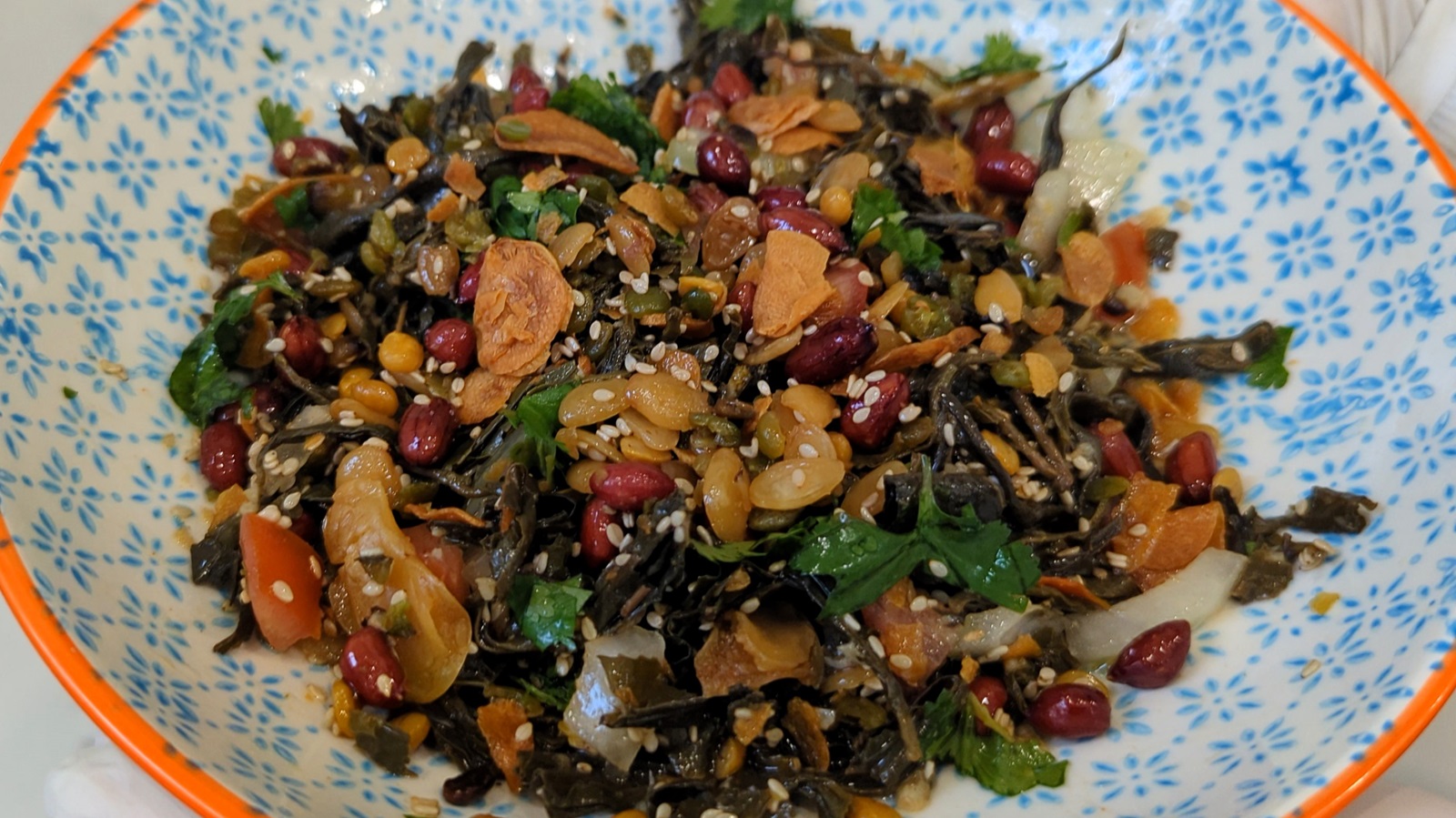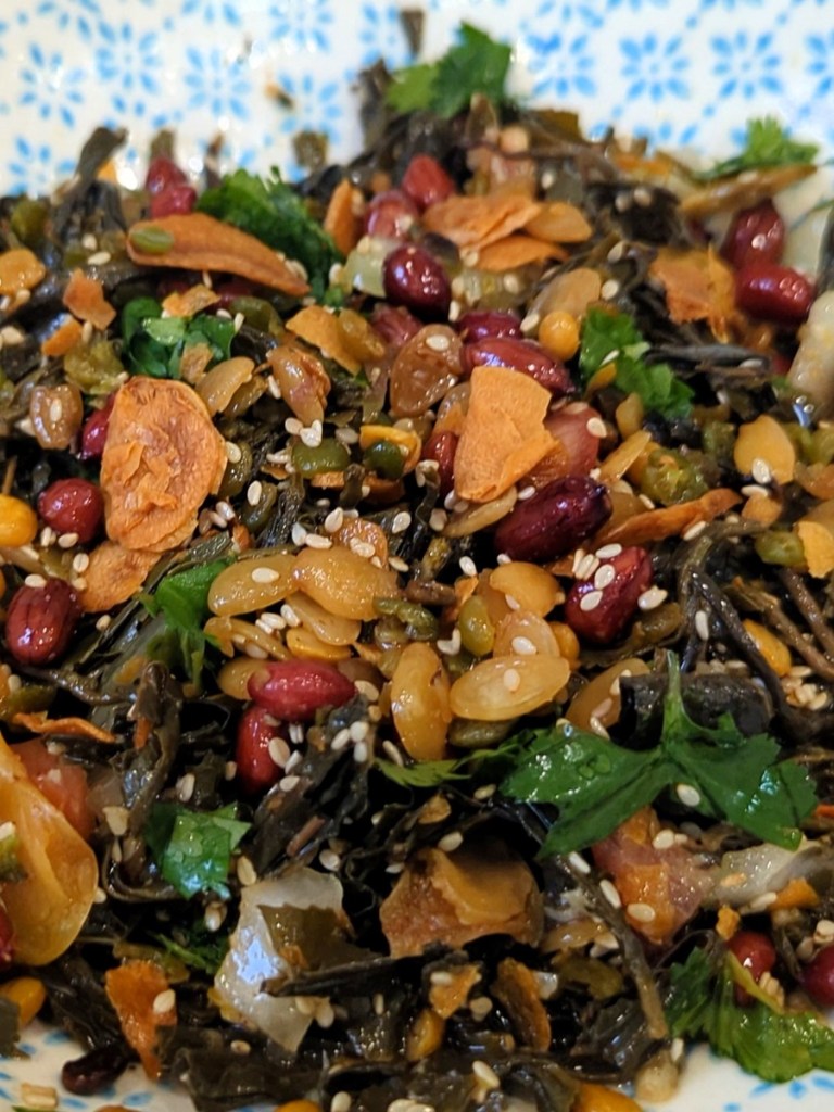 Burmese Tea Leaf Salad, also known as Lahpet Thoke. This salad combines an eclectic mix of flavours and textures, including soft, pickled tea leaves, crisp roasted peanuts, and a variety of crunchy beans. It's not only a delightful culinary experience but also a vegan-friendly recipe